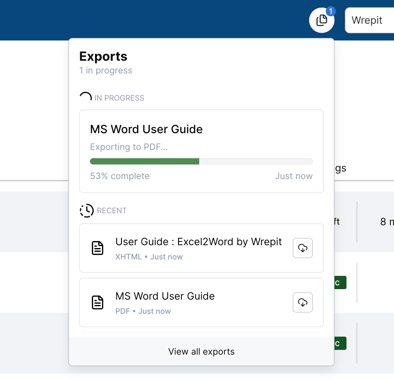You can view all exports by clicking Exports in the top navigation bar.