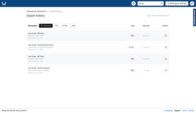 If you’ve exported multiple PDFs or XHTML files from the same publication, but only want to see the most recent exports from the current active draft, turn on this toggle to hide exports from older drafts.