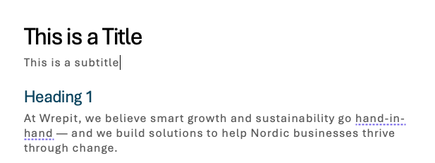 Note that Wrepit will override all Word formatting in the Portal anyway. Only the structure (Title, Subtitle, Heading 1–5) is used when your report is transformed to Wrepit.